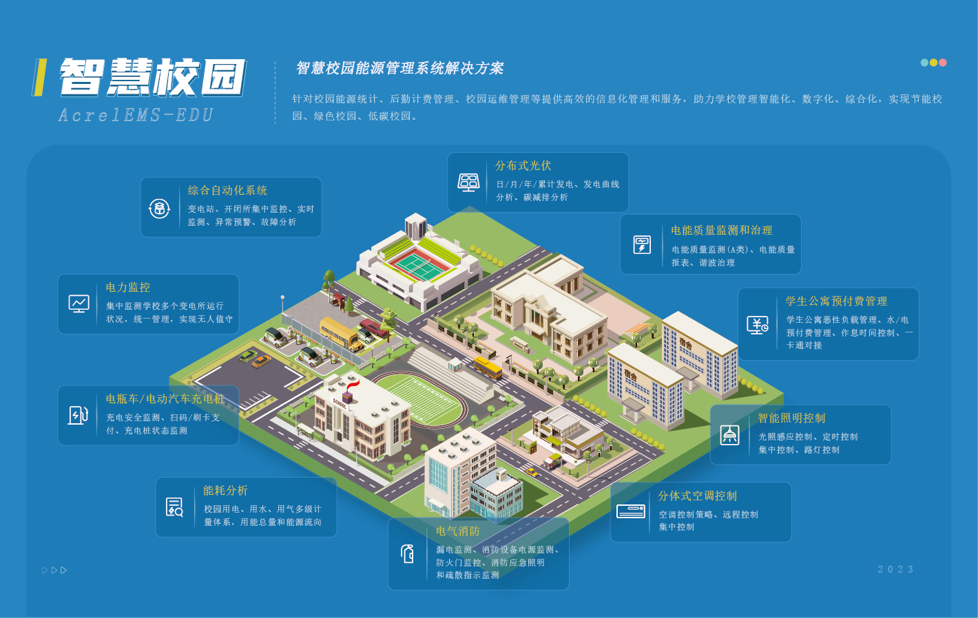 AcrelEMS-EDU校园综合能效管理解决方案针对校园能源统计、后勤计费管理、校园运维管理等提供高校的信息化管理平台。从“源、网、荷、储、充"多个角度解析高校当下及未来的用能问题及用能需求,在统一的需求下“实现能源互补、信息互通"等管理模式。助力学校管理智能化、数字化、综合化,实现节能校园、绿色校园、低碳校园。